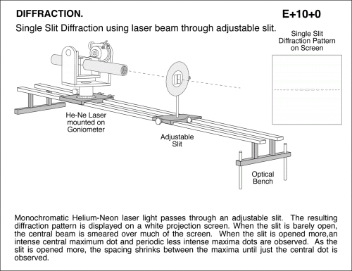 Single Slit Diffraction using laser beam through adjustable slit. Monochromatic Helium-Neon laser light passes through an adjustable slit. The resulting diffraction pattern is displayed on a white projection screen. When the slit is barely open, the central beam is smeared over much of the screen. When the slit is opened more,an intense central maximum dot and periodic less intense maxima dots are observed. As the slit is opened more, the spacing shrinks between the maxima until just the central dot is observed.