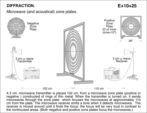 Microwave (and acoustical) zone plates. A 3 cm. microwave transmitter is placed 102 cm. from a microwave zone plate (positive or negative ) constructed of rings of thin metal. When the transmitter is turned on, it sends microwaves through the zone plate which focuses the microwaves at approximately 110 cm from the plate. The microwave receiver emits a tone when it detects microwaves. The receiver is moved around until it finds the focus: the focus will be very loud in contrast to the nonfocused areas. (Both negative and positive zone plates focus the microwaves).