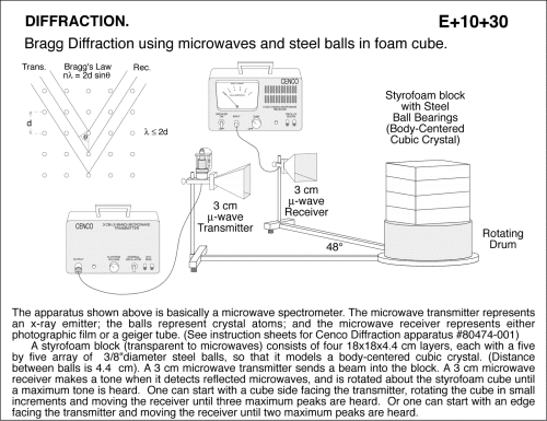 Bragg Diffraction using microwaves and steel balls in foam cube. The apparatus shown above is basically a microwave spectrometer. The microwave transmitter represents an x-ray emitter; the balls represent crystal atoms; and the microwave receiver represents either photographic film or a geiger tube. (See instruction sheets for Cenco Diffraction apparatus #80474-001) A styrofoam block (transparent to microwaves) consists of four 18x18x4.4 cm layers, each with a five by five array of 3/8"diameter steel balls, so that it models a body-centered cubic crystal. (Distance between balls is 4.4 cm). A 3 cm microwave transmitter sends a beam into the block. A 3 cm microwave receiver makes a tone when it detects reflected microwaves, and is rotated about the styrofoam cube until a maximum tone is heard. One can start with a cube side facing the transmitter, rotating the cube in small increments and moving the receiver until three maximum peaks are heard. Or one can start with an edge facing the transmitter and moving the receiver until two maximum peaks are heard.
