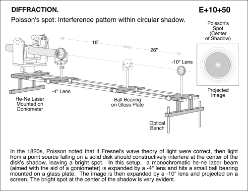 Poisson's spot: Interference pattern within circular shadow. In the 1820s, Poisson noted that if Fresnel's wave theory of light were correct, then light from a point source falling on a solid disk should constructively interfere at the center of the disk's shadow, leaving a bright spot. In this setup, a monochromatic he-ne laser beam (aimed with the aid of a goniometer) is expanded by a -4" lens and hits a small ball bearing mounted on a glass plate. The image is then expanded by a -10" lens and projected on a screen. The bright spot at the center of the shadow is very evident.