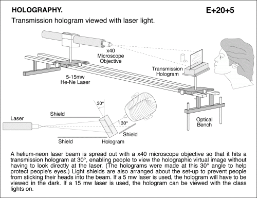 Transmission hologram viewed with laser light. A helium-neon laser beam is spread out with a x40 microscope objective so that it hits a transmission hologram at 30 deg , enabling people to view the holographic virtual image without having to look directly at the laser. (The holograms were made at this 30 deg angle to help protect people's eyes.) Light shields are also arranged about the set-up to prevent people from sticking their heads into the beam. If a 5 mw laser is used, the hologram will have to be viewed in the dark. If a 15 mw laser is used, the hologram can be viewed with the class lights on.