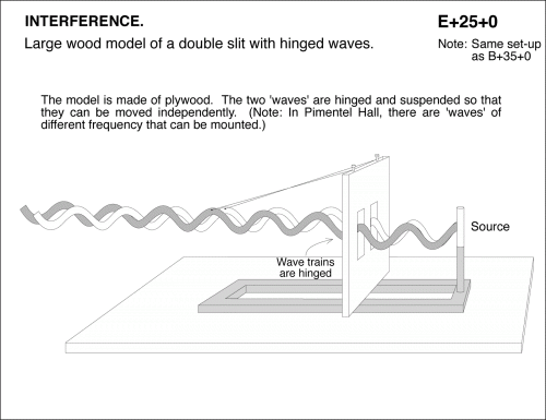 Large wood model of a double slit with hinged waves. Note: Same set-up as X. The model is made of plywood. The two 'waves' are hinged and suspended so that they can be moved independently. (Note: In Pimentel Hall, there are 'waves' of different frequency that can be mounted.)