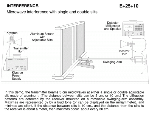 Microwave interference with single and double slits. In this demo, the transmitter beams 3 cm microwaves at either a single or double adjustable slit made of aluminum. (The distance between slits can be 5 cm. or 10 cm.) The diffraction patterns are detected by the receiver mounted on a moveable swinging-arm assembly. Maximas are represented by by a loud tone (or can be displayed on the milliammeter), and minimas are silent. If the distance between slits is 10 cm., and the distance from the slits to the receiver is about a meter, then maximas occur about every 30 cm.