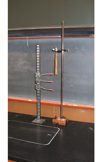 Weight on a vertical spring with markers on stand.