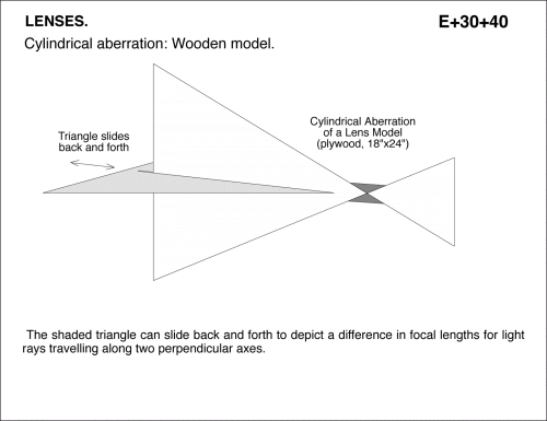 Cylindrical aberration: Wooden model. The shaded triangle can slide back and forth to depict a difference in focal lengths for light rays travelling along two perpendicular axes.