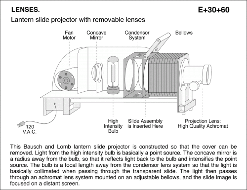 Lantern slide projector with removable housing This Bausch and Lomb lantern slide projector is constructed so that the cover can be removed. Light from the high intensity bulb is basically a point source. The concave mirror is a radius away from the bulb, so that it reflects light back to the bulb and intensifies the point source. The bulb is a focal length away from the condensor lens system so that the light is basically collimated when passing through the transparent slide. The light then passes through an achromat lens system mounted on an adjustable bellows, and the slide image is focused on a distant screen.