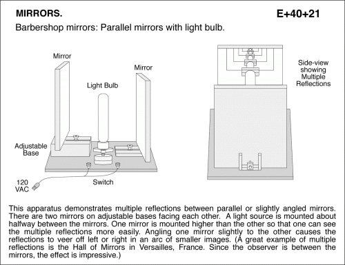 Barbershop mirrors: Parallel mirrors with light bulb. This apparatus demonstrates multiple reflections between parallel or slightly angled mirrors. There are two mirrors on adjustable bases facing each other. A light source is mounted about halfway between the mirrors. One mirror is mounted higher than the other so that one can see the multiple reflections more easily. Angling one mirror slightly to the other causes the reflections to veer off left or right in an arc of smaller images. (A great example of multiple reflections is the Hall of Mirrors in Versailles, France. Since the observer is between the mirrors, the effect is impressive.)