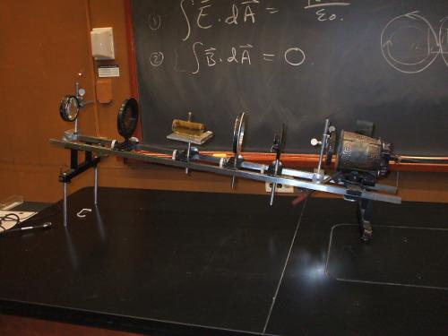 Optical rotation of polarized light by sugar solution, using arc lamp.