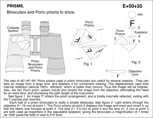 Binoculars and Porro prisms to show. The sets of 45 deg -45 deg -90 deg Porro prisms used in prism binoculars are useful for several reasons. They can take an image from a large lens, and displace it for convenient viewing. This displacement uses total internal reflection (almost 100% efficient), which is better than mirrors. Thus the image will be brighter. Also, the two Porro prism system erects and reverts the image from the objective, eliminating the need for an extra lens, and shortening the path length of the instrument. See figure 1. An image 'F' enters the prism arrangement, and is totally internally reflected, exiting with the F erected and reverted. Each half of a prism binoculars is really a simple telescope. See figure 2. Light enters through the objective (f.l. 19 cm) at point 1. The Porro prisms at point 2 displace the image and erect and revert it, so that the beam now focuses at point 3. The lens (f.l. 4.5 cm) at point 4 and the lens (f.l. 3 cm) at point 5 are both used as magnifiers in the adjustable eyepiece, giving the binoculars a magnification of 7 times (at 1000 yards the field of view is 372 feet).