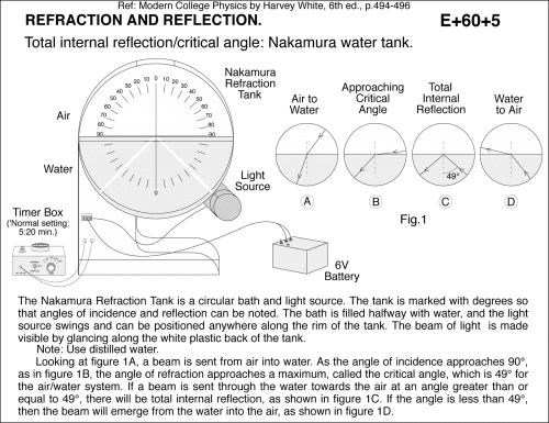 Total internal reflection/critical angle: Nakamura water tank. Air Water Light Source Nakamura Refraction Tank 6V Battery The Nakamura Refraction Tank is a circular bath and light source. The tank is marked with degrees so that angles of incidence and reflection can be noted. The bath is filled halfway with water, and the light source swings and can be positioned anywhere along the rim of the tank. The beam of light is made visible by glancing along the white plastic back of the tank. Note: Use distilled water. Looking at figure 1A, a beam is sent from air into water. As the angle of incidence approaches 90 deg , as in figure 1B, the angle of refraction approaches a maximum, called the critical angle, which is 49 deg for the air/water system. If a beam is sent through the water towards the air at an angle greater than or equal to 49 deg , there will be total internal reflection, as shown in figure 1C. If the angle is less than 49 deg , then the beam will emerge from the water into the air, as shown in figure 1D. Ref: Modern College Physics by Harvey White, 6th ed., p.494-496