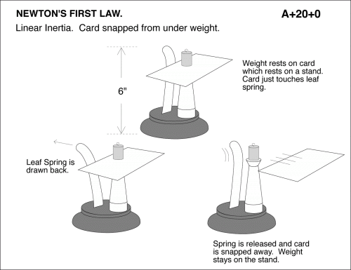 Linear Inertia. Weight rests on card which rests on a stand. Card just touches leaf 6" spring. Card snapped from under weight. Leaf Spring is drawn back. Spring is released and card is snapped away. Weight stays on the stand.