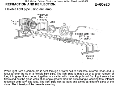 Flexible light pipe using arc lamp. White light from a carbon arc is sent through a water cell to eliminate infrared (heat) and is focused onto the tip of a flexible light pipe. The light pipe is made up of a large number of long thin glass fibers bound together in a cable, with the ends polished flat. Light enters the fibers and hits the glass walls at an angle greater than the critical angle, causing total internal reflection with very little loss. The light pipe can be bent and aimed at different parts of the class. The intensity of the beam is amazing. Ref: Modern College Physics by Harvey White, 6th ed., p.495-497