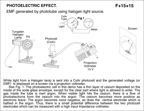 EMF generated by phototube using halogen light source. White light from a Halogen lamp is sent into a CsAr photocell and the generated voltage (or EMF) is displayed on a screen via a projection voltmeter. See Fig. 1. The photoelectric cell in this demo has a thin layer of cesium deposited on the inside of the soda glass envelope, except for the clear part where light is allowed to enter. The gas inside the tube is inert argon. When visible light hits the cesium, there is a flow of photoelectrons from the cesium into the argon. The cesium becomes more positive as electrons leave. The argon becomes more negative, as does the central electrode which is bathed in the argon. Thus, there is a small potential difference between the two photocell electrodes which can be measured with a high input impedance voltmeter.