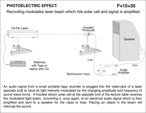 Recording modulates laser beam which hits solar cell and signal is amplified. An audio signal from a small portable tape recorder is plugged into the video-jack of a laser specially built to have its light intensity modulated by the changing amplitude and frequency of sound wave forms. A hooded silicon solar cell at the opposite end of the lecture table receives the modulated light beam, converting it, once again, to an electrical audio signal which is then amplified and sent to a speaker for the class to hear. Placing an object in the beam will interrupt the sound.