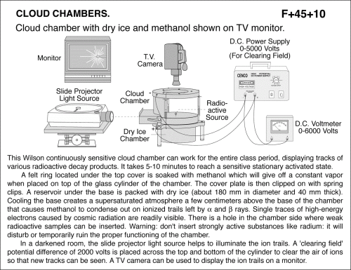 Cloud chamber with dry ice and methanol shown on TV monitor. This Wilson continuously sensitive cloud chamber can work for the entire class period, displaying tracks of various radioactive decay products. It takes 5-10 minutes to reach a sensitive stationary activated state. A felt ring located under the top cover is soaked with methanol which will give off a constant vapor when placed on top of the glass cylinder of the chamber. The cover plate is then clipped on with spring clips. A reservoir under the base is packed with dry ice (about 180 mm in diameter and 40 mm thick). Cooling the base creates a supersaturated atmosphere a few centimeters above the base of the chamber that causes methanol to condense out on ionized trails left by _ and _ rays. Single traces of high-energy electrons caused by cosmic radiation are readily visible. There is a hole in the chamber side where weak radioactive samples can be inserted. Warning: don't insert strongly active substances like radium: it will disturb or temporarily ruin the proper functioning of the chamber. In a darkened room, the slide projector light source helps to illuminate the ion trails. A 'clearing field' potential difference of 2000 volts is placed across the top and bottom of the cylinder to clear the air of ions so that new tracks can be seen. A TV camera can be used to display the ion trails on a monitor.