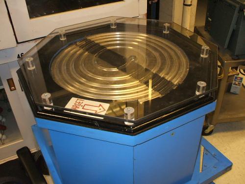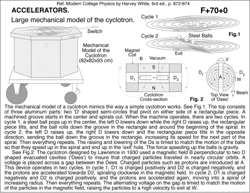 Large mechanical model of the cyclotron. Ref.:Modern College Physics by Harvey White, 6rd ed., p. 872-874 The mechanical model of a cyclotron mimics the way a simple cyclotron works. See Fig.1. The top consists of three aluminum parts: two 'D' shaped semi-circles that pivot on either side of a rectangular piece. A machined groove starts in the center and spirals out. When the machine operates, there are two cycles. In cycle 1, a steel ball pops up in the center, the left D lowers down while the right D raises up, the rectangular piece tilts, and the ball rolls down the groove in the rectangle and around the beginning of the spiral. In cycle 2, the left D raises up, the right D lowers down and the rectangular piece tilts in the opposite direction, sending the ball down the groove in the rectangle, increasing its speed for the next part of the spiral. Then everything repeats. The raising and lowering of the Ds is timed to match the motion of the balls so that they speed up in the spiral and end up in the 'exit' hole. The force speeding up the balls is gravity. See Fig.2. The cyclotron designed by Lawrence in 1930 used a magnetic field B perpendicular to two D shaped evacuated cavities ('Dees') to insure that charged particles traveled in nearly circular orbits. A voltage is placed across a gap between the Dees. Charged particles such as protons are introduced at A. This device operates in two cycles. In cycle 1, D1 is charged positively and D2 is charged negatively, and the protons are accelerated towards D2, spiraling clockwise in the magnetic field. In cycle 2, D1 is charged negatively and D2 is charged positively, and the protons are accelerated again, moving into a spiral of increasing radius. Then everything repeats. The alternating voltage on the gap is timed to match the motion of the particles in the magnetic field, raising the particles to a high velocity to exit at W.
