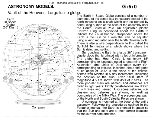 Vault of the Heavens: Large lucite globe. The Earth in Space Globe consists of a number of elements. At the center is a transparent model of the earth mounted on a shaft which can be rotated by hand using a knob at the base of the assembly near the South Celestial Pole. An adjustable plastic 'Horizon Ring' is positioned about the Earth to indicate the visual horizon. Suspended above the Earth is the Sun on a wire that can be adjusted using a knob mounted near the North Celestial Pole. There is also a wire perpendicular to this called the Sunlight Terminator wire, which shows where the Sun is rising and setting. Surrounding the Earth is a large 36" transparent plastic globe that is printed with a lot of information. The globe has Hour Circle Lines every 15 deg corresponding to longitude (used to determine Right Ascension) and Lines of Declination every 10 deg , corresponding to latitude. Inscribed about the globe at an angle of 23.5 deg is the plane of the ecliptic, printed with Months in 5 day increments, indicating the position of the Sun. Over 1100 stars to magnitude 4.5 are shown with dots of 7 sizes. The more popular stars are named, and distances are given in light years. Eighty constellations are drawn in with lines and named. Also some nebulae, star clusters and galaxies are shown, as well as boundaries of the Milky Way. The precessional path of the North and South Celestial Poles are shown. A compass is mounted at the base of the entire assembly. Following the procedures outlined in the Farquhar manual, the Earth is oriented in space so that the Sun and stars are at their correct locations for the current date and time. Earth in Space Globe (36" Diam.) Compass Ref.:Teacher's Manual For Farquhar, p.11-18