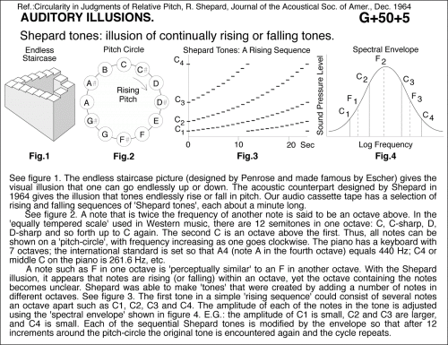 Shepard tones: illusion of continually rising or falling tones. See figure 1. The endless staircase picture (designed by Penrose and made famous by Escher) gives the visual illusion that one can go endlessly up or down. The acoustic counterpart designed by Shepard in 1964 gives the illusion that tones endlessly rise or fall in pitch. Our audio cassette tape has a selection of rising and falling sequences of 'Shepard tones', each about a minute long. See figure 2. A note that is twice the frequency of another note is said to be an octave above. In the 'equally tempered scale' used in Western music, there are 12 semitones in one octave: C, C-sharp, D, D-sharp and so forth up to C again. The second C is an octave above the first. Thus, all notes can be shown on a 'pitch-circle', with frequency increasing as one goes clockwise. The piano has a keyboard with 7 octaves; the international standard is set so that A4 (note A in the fourth octave) equals 440 Hz; C4 or middle C on the piano is 261.6 Hz, etc. A note such as F in one octave is 'perceptually similar' to an F in another octave. With the Shepard illusion, it appears that notes are rising (or falling) within an octave, yet the octave containing the notes becomes unclear. Shepard was able to make 'tones' that were created by adding a number of notes in different octaves. See figure 3. The first tone in a simple 'rising sequence' could consist of several notes an octave apart such as C1, C2, C3 and C4. The amplitude of each of the notes in the tone is adjusted using the 'spectral envelope' shown in figure 4. E.G.: the amplitude of C1 is small, C2 and C3 are larger, and C4 is small. Each of the sequential Shepard tones is modified by the envelope so that after 12 increments around the pitch-circle the original tone is encountered again and the cycle repeats. Ref.:Circularity in Judgments of Relative Pitch, R. Shepard, Journal of the Acoustical Soc. of Amer., Dec. 1964