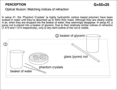 Optical Illusion: Matching indices of refraction. In setup #1, the 'Phantom Crystals' (a highly hydrophilic carbon based polymer) have been soaked in water until they've absorbed up to 300x their mass. Although they are clearly visible in air, when they are dropped into the beaker of water, they seemingly disappear. In setup #2, a pyrex rod is placed into a beaker of glycerin. Due to their relatively similar indices of refraction (1.473 and 1.474 respectively), only a very faint outline of the rod is visible.