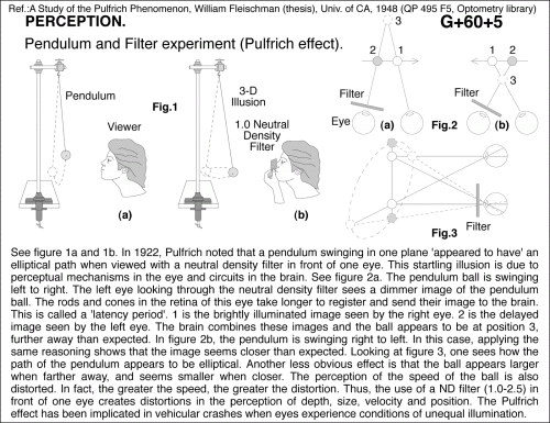 Pendulum and polaroid experiment. See figure 1a and 1b. In 1992, Pulfrich noted that a pendulum swinging in one plane 'appeared to have' an elliptical path when viewed with a neutral density filter in front of one eye. This startling illusion is due to perceptual mechanisms in the eye and circuits in the brain. See figure 2a. The pendulum ball is swinging left to right. The left eye looking through the neutral density filter sees a dimmer image of the pendulum ball. The rods and cones in the retina of this eye take longer to register and send their image to the brain. This is called a 'latency period'. 1 is the brightly illuminated image seen by the right eye. 2 is the delayed image seen by the left eye. The brain combines these images and the ball appears to be at position 3, further away than expected. In figure 2b, the pendulum is swinging right to left. In this case, applying the same reasoning shows that the image seems closer than expected. Looking at figure 3, one sees how the path of the pendulum appears to be elliptical. Another less obvious effect is that the ball appears larger when farther away, and seems smaller when closer. The perception of the speed of the ball is also distorted. In fact, the greater the speed, the greater the distortion. Thus, the use of a ND filter (1.0-2.5) in front of one eye creates distortions int he perception of depth, size, velocity and position. The Pulfrich effect has been implicated in vehicular crashes when eyes experience conditions of unequal illumination.