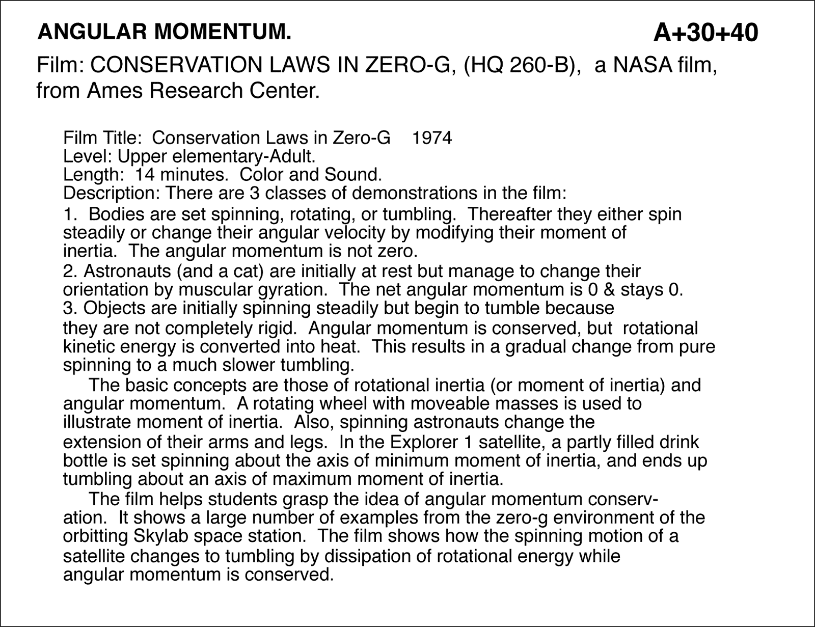 Film: CONSERVATION LAWS IN ZERO-G, (HQ 260-B), a NASA film, from Ames Research Center. Film Title: Conservation Laws in Zero-G 1974 Level: Upper elementary-Adult. Length: 14 minutes. Color and Sound. Description: There are 3 classes of demonstrations in the film: 1. Bodies are set spinning, rotating, or tumbling. Thereafter they either spin steadily or change their angular velocity by modifying their moment of inertia. The angular momentum is not zero. 2. Astronauts (and a cat) are initially at rest but manage to change their orientation by muscular gyration. The net angular momentum is 0 & stays 0. 3. Objects are initially spinning steadily but begin to tumble because they are not completely rigid. Angular momentum is conserved, but rotational kinetic energy is converted into heat. This results in a gradual change from pure spinning to a much slower tumbling. The basic concepts are those of rotational inertia (or moment of inertia) and angular momentum. A rotating wheel with moveable masses is used to illustrate moment of inertia. Also, spinning astronauts change the extension of their arms and legs. In the Explorer 1 satellite, a partly filled drink bottle is set spinning about the axis of minimum moment of inertia, and ends up tumbling about an axis of maximum moment of inertia. The film helps students grasp the idea of angular momentum conservation. It shows a large number of examples from the zero-g environment of the orbitting Skylab space station. The film shows how the spinning motion of a satellite changes to tumbling by dissipation of rotational energy while angular momentum is conserved.