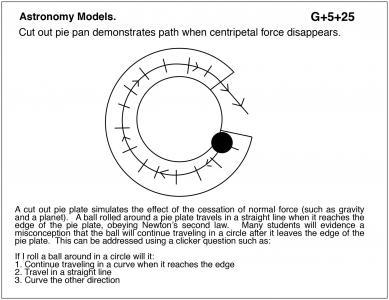 A cut out pie plate simulates the effect of the cessation of normal force (such as gravity and a planet). A ball rolled around a pie plate travels in a straight line when it reaches the edge of the pie plate, obeying Newton’s second law. Many students will evidence a misconception that the ball will continue traveling in a circle after it leaves the edge of the pie plate. This can be addressed using a clicker question such as: