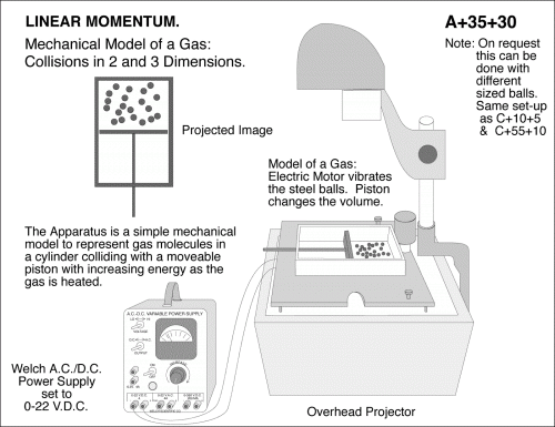 Mechanical Model of a Gas: Collisions in 2 and 3 Dimensions. The Apparatus is a simple mechanical model to represent gas molecules in a cylinder colliding with a moveable piston with increasing energy as the gas is heated. Model of a Gas: Electric Motor vibrates the steel balls. Piston changes the volume. Note: On request this can be done with different sized balls. Same set-up as C+10+5 and C+55+10
